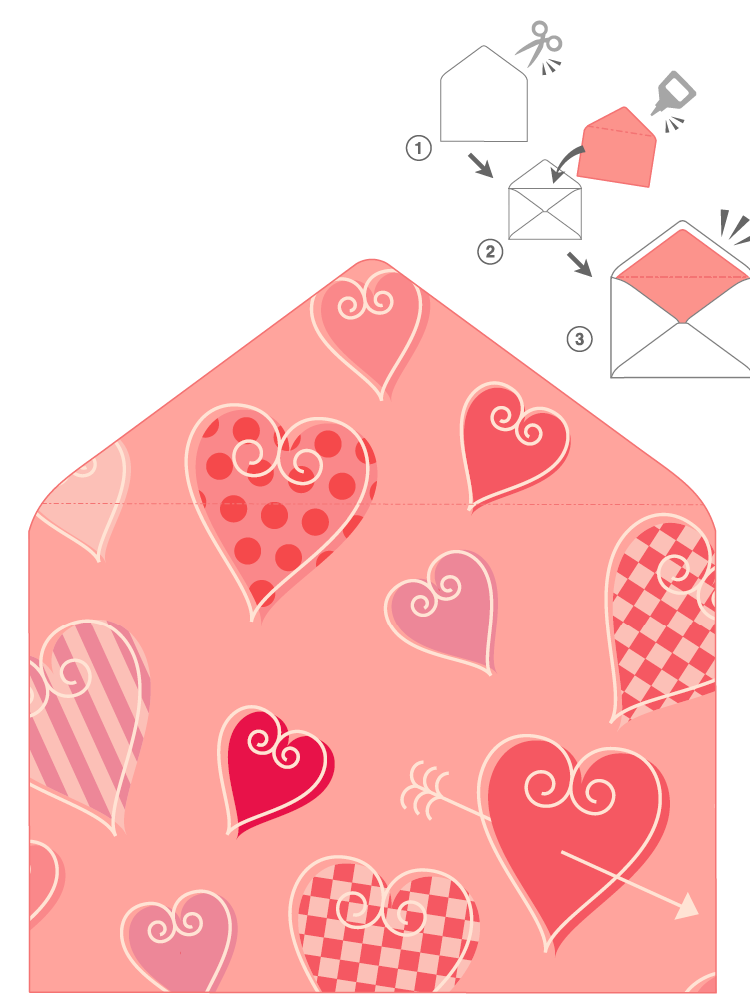 Конверты на День Святого Валентина можно купить, а можно самостоятельно сделать своими руками. Подарки сделанные своими руками ценятся гораздо больше, особенно на день Святого Валентина. Выкройка конверта